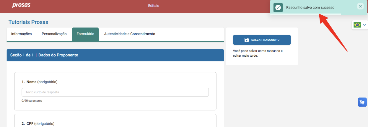 Para certificar que o rascunho foi salvo, a plataforma exibirá a mensagem “Rascunho salvo com sucesso” no canto superior direito da tela.