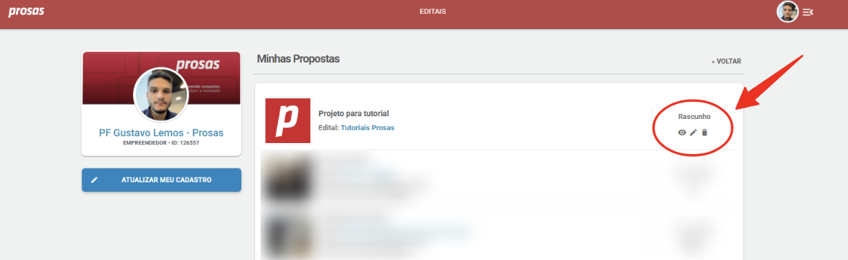 02. Verifique, dentre as suas propostas, o rascunho salvo. Para retomar ao preenchimento basta clicar no ícone “lápis”.